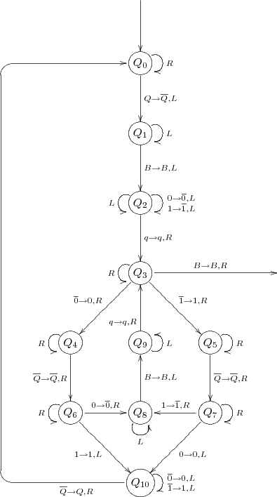 - If it doesn’t match, then move back erasing marked bits, until we hit the state marker, Q, and unmark it, stepping to the Right so that we’ll pick up the next state in the next iteration of the loop.